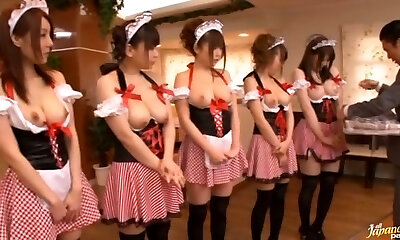 cinq cascadeurs chinois en costume avec de gros seins pour s'amuser avec