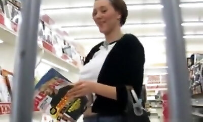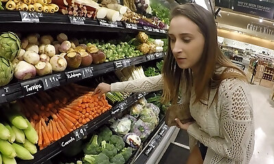 Inspiring senorita visits the supermarket for the crazy flashing