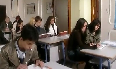 en l'absence du professeur, ma camarade de classe aux seins parfaits et moi nous amusons à baiser sur les bureaux de la classe