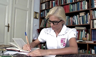 Nerdy coed studying in the library ends up getting humped